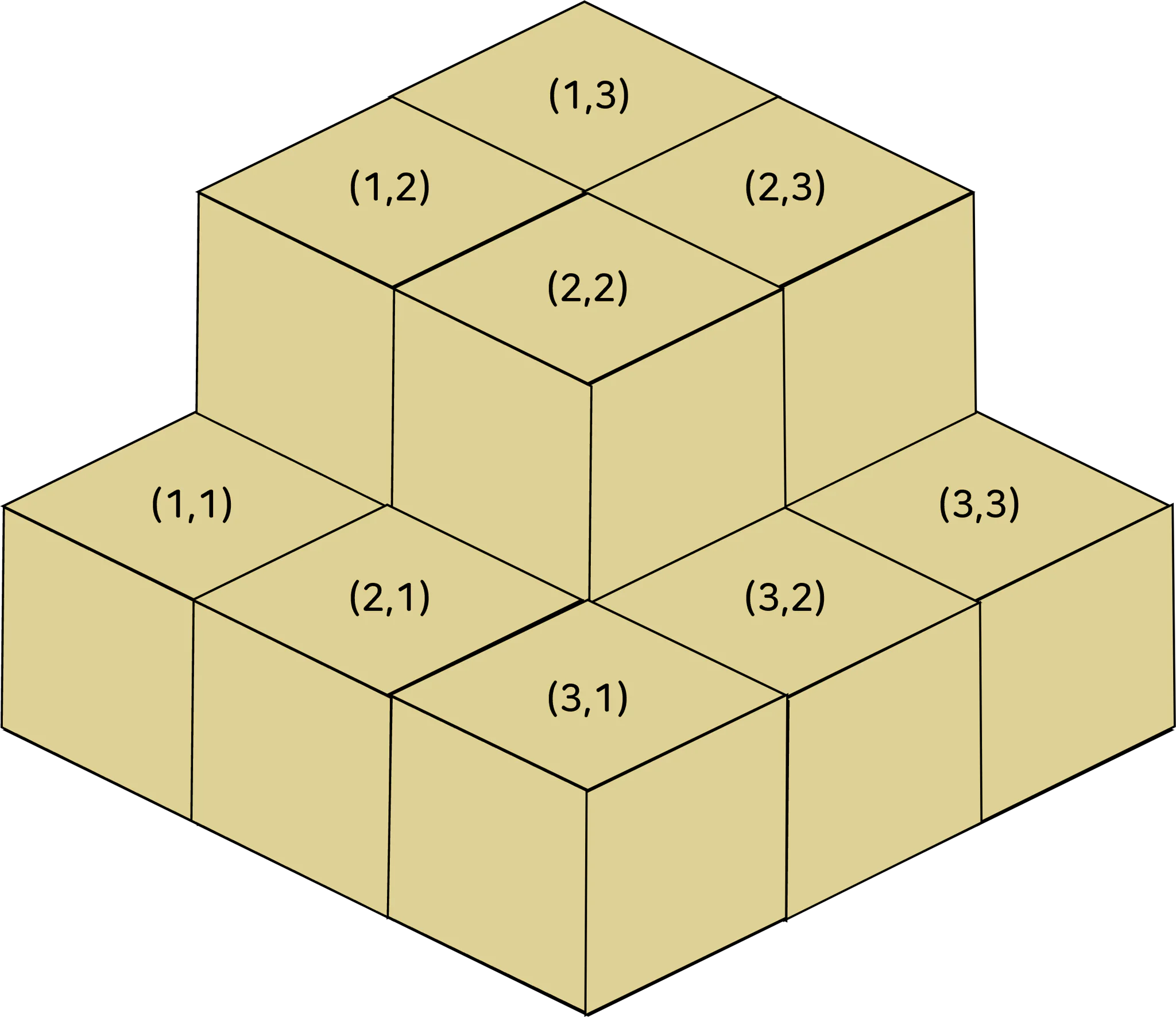 격자의 각 칸은 크기 1의 정사각형 모양이며, 모든 택배 상자는 부피 1의 직육면체 형태이다.
